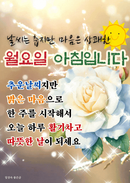 "날씨는 춥지만 마음은 상쾌한, 월요일 아침입니다! 추운날씨지만 밝은 마음으로 한주를 시작해서 오늘 하루 활기차고 따뜻한 날이 되세요"